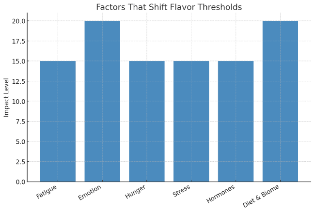 We each have different thresholds for flavors. A threshold is the minimum concentration of a substance in a mixture that you can detect. You may have a high threshold for coconut, which means you find it hard to identify. Or you may have a low threshold for sulfur, which means you are very sensitive to it. But your thresholds change daily – even hourly. Why?